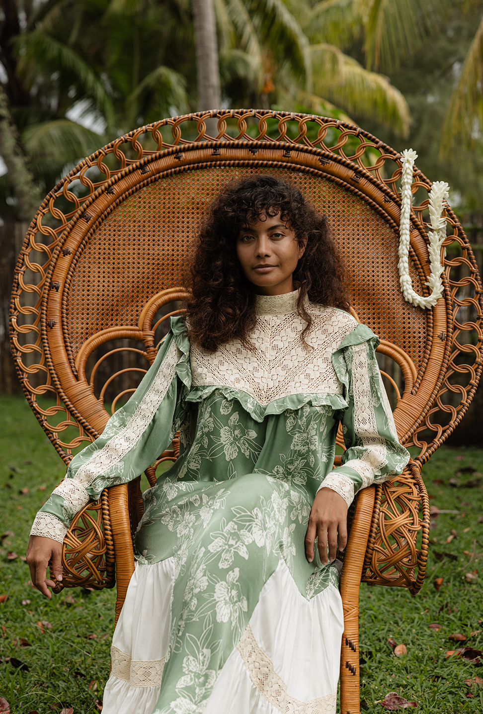 The POMARE dress is the most regal piece of the Matavai Collection, echoing the missionary era with its modest, flowing silhouette. Crafted in luminous silk, it features lace, ruffles, long sleeves, and a high neckline, with plain fabric meeting the Oka floral motif at the hem. Named for the Tahitian royal dynasty, POMARE unites memory and tradition in a timeless expression of Polynesian elegance.